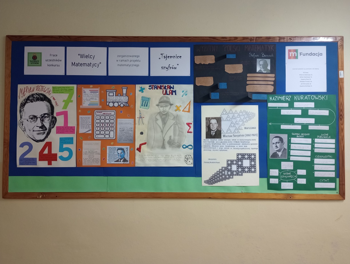 W ramach projektu, odbył się rodzinny konkurs techniczno-plastyczny "Wielcy Matematycy" dla uczniów klas IV-VIII i ich krewnych. Uczestnicy tej rywalizacji wyszukiwali i selekcjonowali informacje dotyczące sylwetki i dokonań wybranego polskiego matematyka, a następnie prezentowali je na plakacie. O ich kreatywności i oryginalności można się przekonać oglądając najwyżej ocenione prace na dwóch tablicach na parterze.